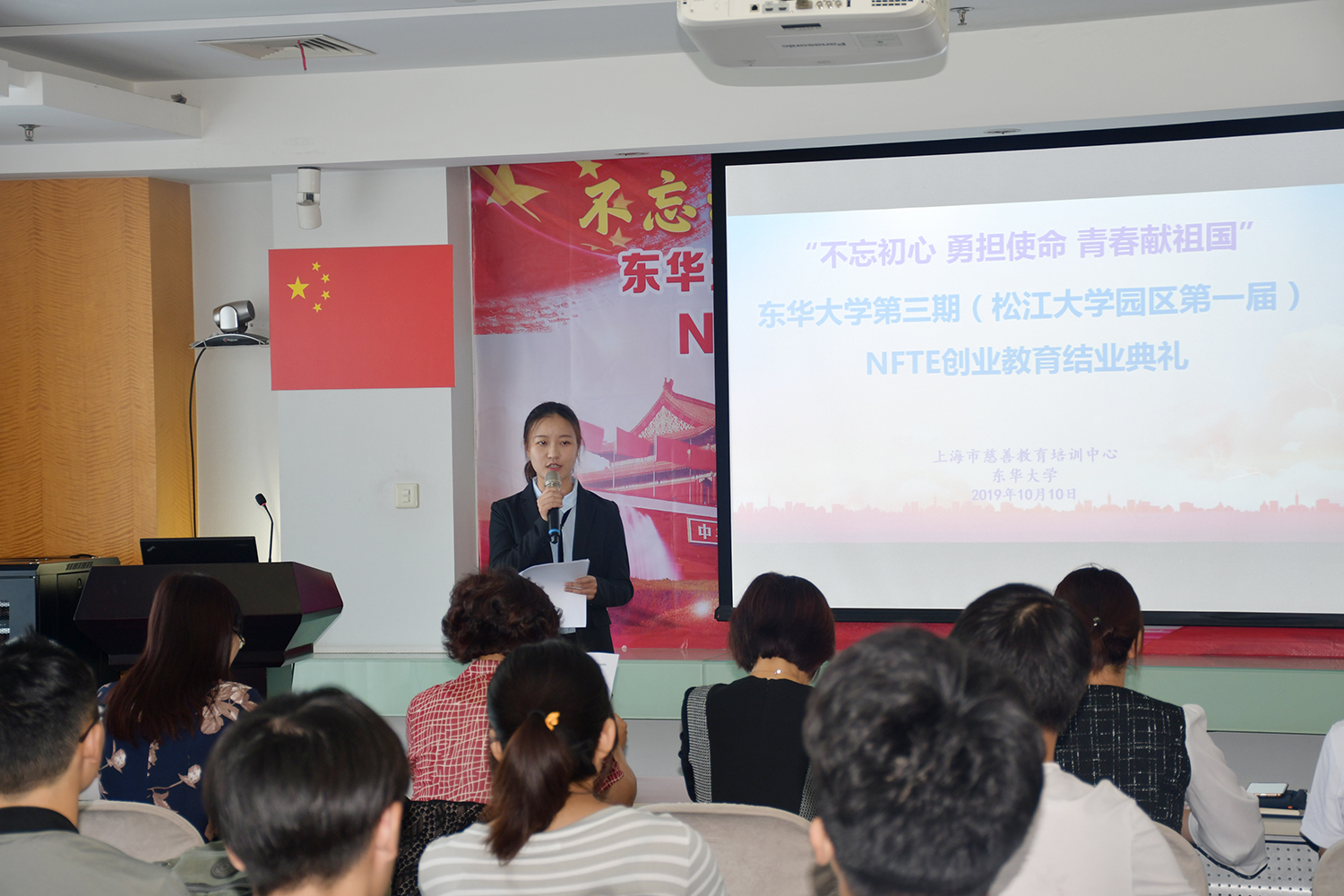 10月10日,“不忘初心 勇担使命 青春献祖国”久久久久国产成人精品亚洲综合第三期(松江大学园区第一届)NFTE创业培训结业典礼在松江校区举行。久久久久国产成人精品亚洲综合党委副书记刘淑慧,中国人力资源开发研究会专家委员会副主任、上海市慈善教育培训中心主任徐佩莉出席活动并讲话,上海市慈善教育培训中心、上海外国语大学、上海视觉艺术学院和我校相关部门负责人以及创业培训班41位结业学员共同参与典礼活动。
