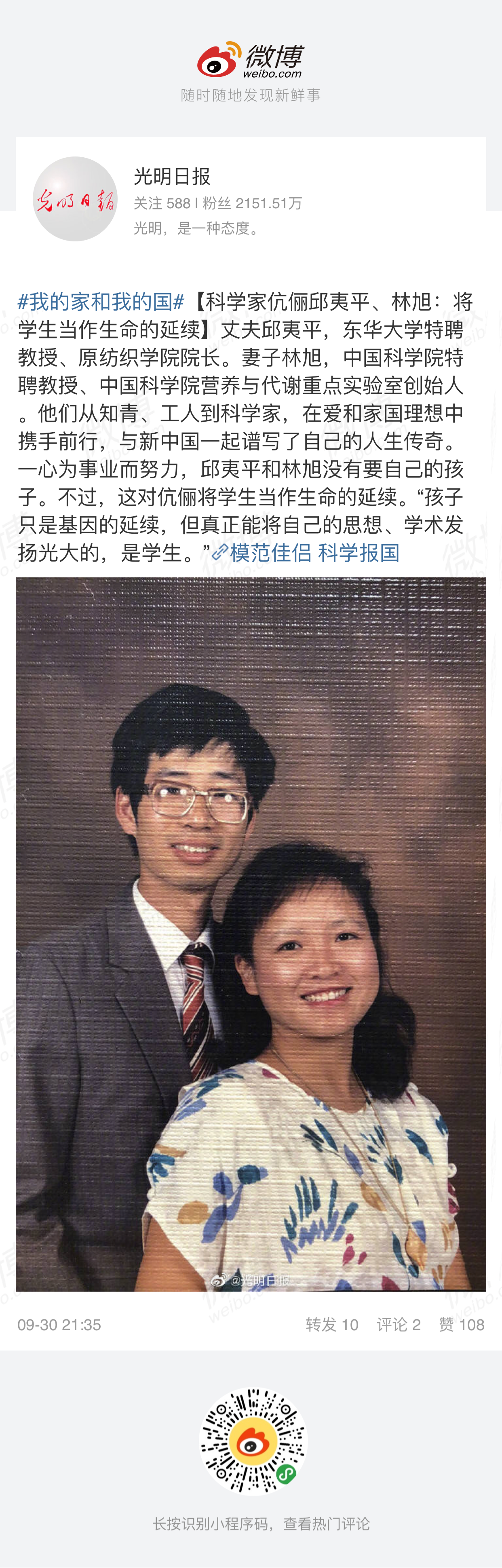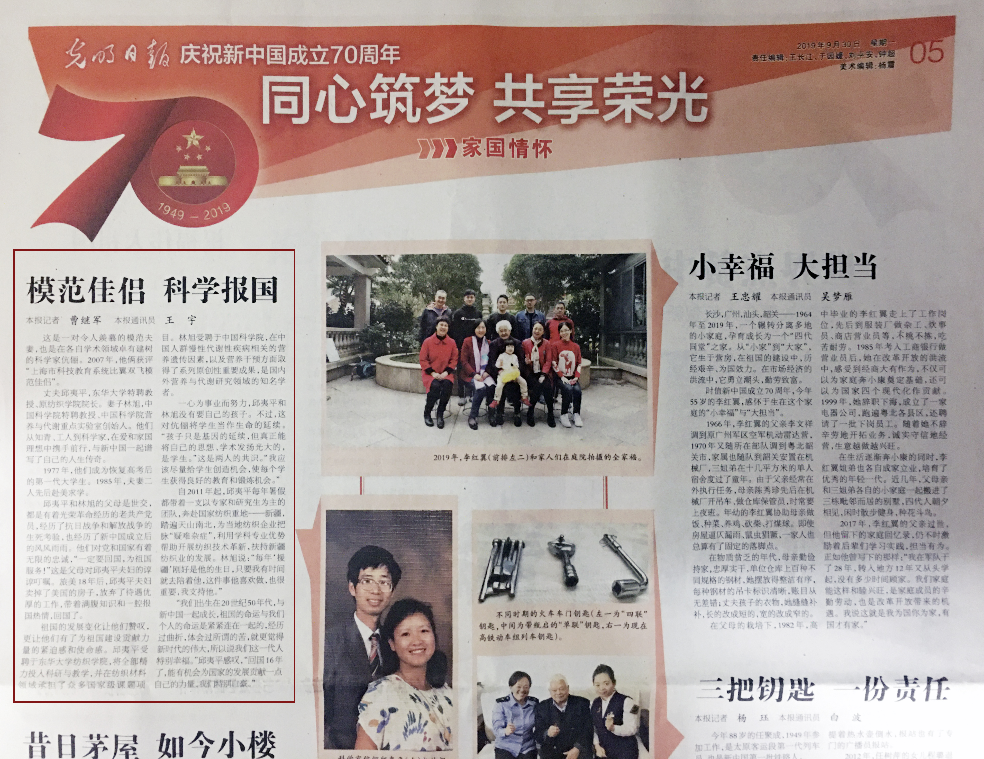 编者按:《光明日报》(2019年09月30日05版)【庆祝新中国成立70周年 同心筑梦 共享荣光 家国情怀】专版头条报道了我校邱夷平和其爱人林旭,他们从知青、工人到科学家,在爱和家国理想中携手前行,与新中国一起谱写了自己的人生传奇的伉俪故事。全文转载如下: