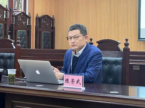 陈荣武围绕十九届五中全会召开的历史方位与时代背景,以及深刻领会、把握十九届五中全会的主要精神,切实学习和贯彻落实好十九届五中全会精神展开。他指出,十九届五中全会是在我国即将进入新发展阶段、实现中华民族伟大复兴的关键时期召开的一次具有全局性、历史性意义的重要会议。会议布置了今后五年乃至十年的远景目标,重点研究“十四五”规划问题,描绘了国家未来发展蓝图,明确了前进方向和奋斗目标,对于激励全党全国各族人民战胜前进道路上风险挑战,对全面建设社会主义现代化国家开好局、起好步具有十分重要的意义。他强调,在抗击新冠肺炎疫情的战斗中,中国制度优势得到凸显。火神山、雷神山医院迅速建成;一方有难八方支援,医务人员和物资调度、武汉“封城”与全国全领域全民行动,凸显中国共产党强大的动员号召和组织凝聚能力;“中国速度”“中国精神”“中国力量”和“中国担当”让世界刮目相看。他引用习近平总书记在党外人士座谈会上发表的重要讲话,指出要总结“十三五”时期的发展成就和经验,科学研判发展环境,深入研究总体思路和主要目标,准确把握重大战略任务,提出深化改革开放重大举措,前瞻性谋划重大风险应对预案。报告最后,陈荣武寄语现场全体党员同志,要统筹中华民族伟大复兴战略全局和世界百年未有之大变局,深刻认识我国社会主要矛盾变化带来的新特征、新要求,深刻认识错综复杂的国际环境带来的新矛盾、新挑战,增强机遇意识和风险意识,立足社会主义初级阶段基本国情,保持战略定力,办好自己的事,认识和把握发展规律,发扬斗争精神,树立底线思维,准确识变、科学应变、主动求变,善于在危机中育先机、于变局中开新局,抓住机遇,应对挑战,奋勇前进。