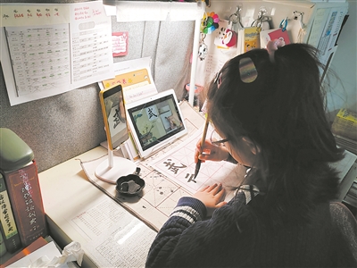 上海市普陀区武宁路小学学生在上线上书法课。资料图片
