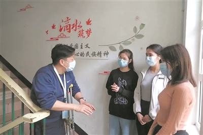 上海商学院文法学院党总支副书记、副院长卞樑(左一)坚守一线和学生共同抗疫。资料图片